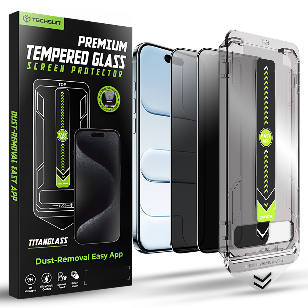 Techsuit TitanGlass FullCover Privacy за iPhone е протектор от закалено стъкло с 9H твърдост и privacy филтър, който ограничава видимостта на екрана отстрани. Стъклото осигурява надеждна защита срещу надрасквания и удари, като същевременно запазва яснотата и чувствителността на дисплея. Комплектът включва 2 броя протектори и рамка за лесен монтаж.